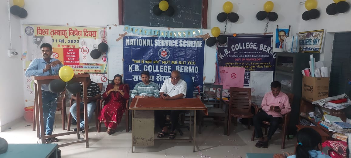 Kathara: केबी कॉलेज बेरमो में 9 सितंबर को राष्ट्रीय सेवा योजना (NSS) के स्वयंसेवकों द्वारा शिक्षक सम्मान समारोह का आयोजन किया गया. इस कार्यक्रम की अध्यक्षता प्राचार्य लक्ष्मी नारायण ने की. कार्यक्रम की शुरुआत सर्वपल्ली राधाकृष्णन की जीवनी पर प्रकाश डालते हुए और गुरु की महिमा तथा उनके योगदानों पर चर्चा करते हुए की गई.